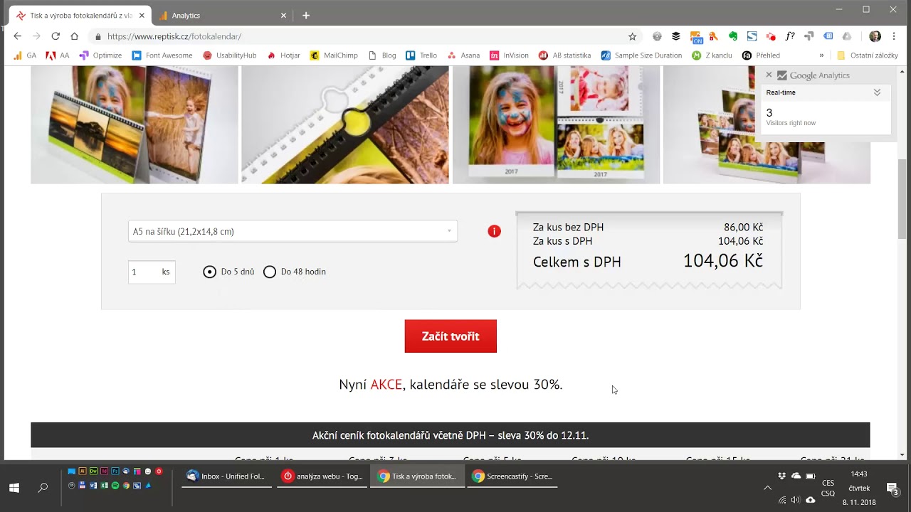 Během 2 hodin proběhl úvodní rozhovor, analýze GAček a mousetrackingu, kontrole konkurence. Zní to vznešeně, ale jen jsem se koukl, co nabízí a za kolik konkurence, na co lidi klikají a kam doskrolují (a co tudíž nevidí) a v datech mrkl, kolik lidí pokračuje do konfigurátoru kalendáře a pak do košíku.